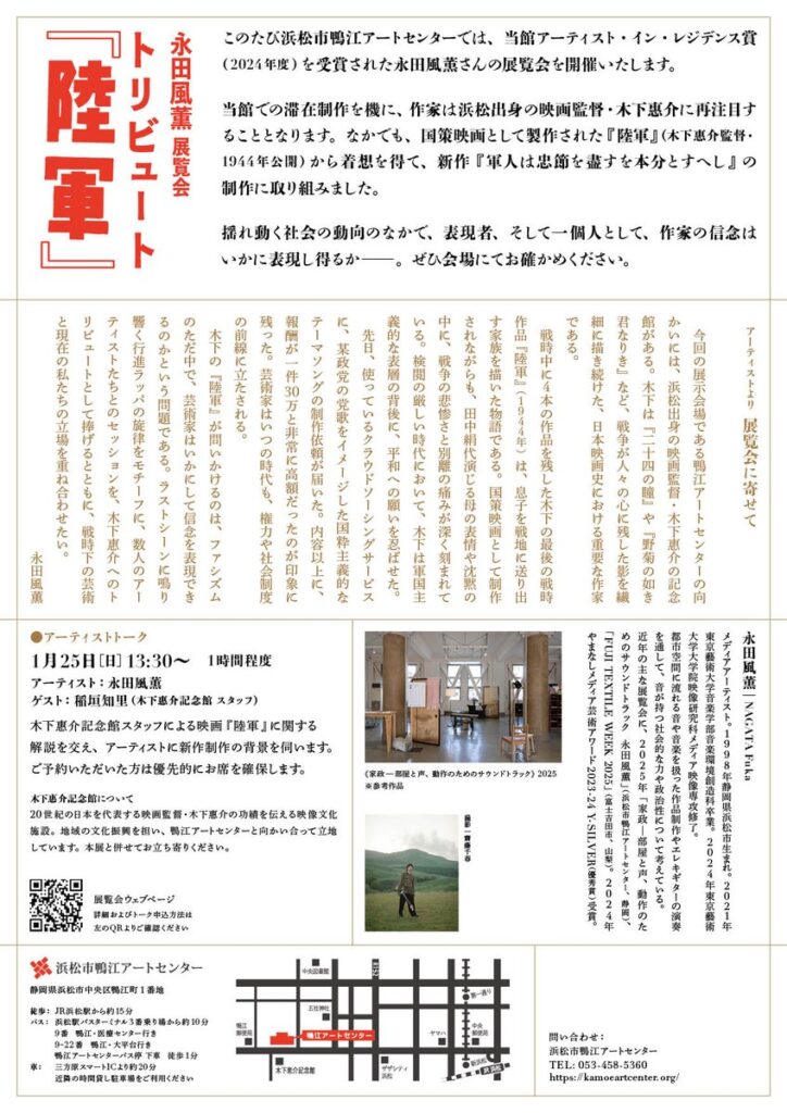 木下惠介記念館スタッフによる映画『陸軍』に関する解説を交え、アーティストに新作制作の背景を伺います。